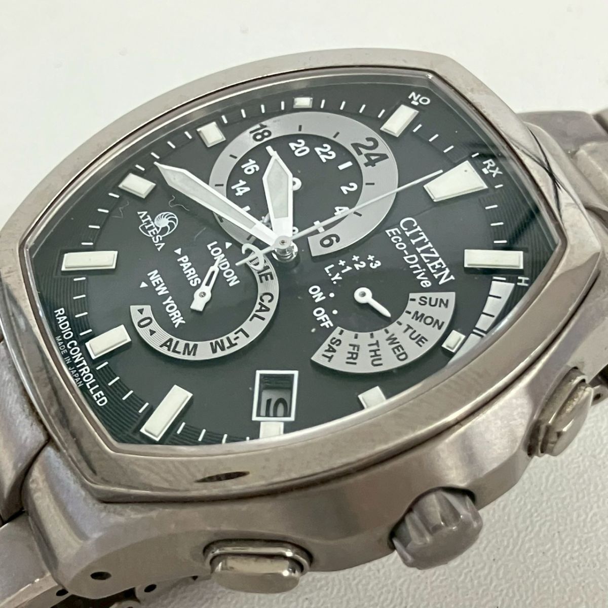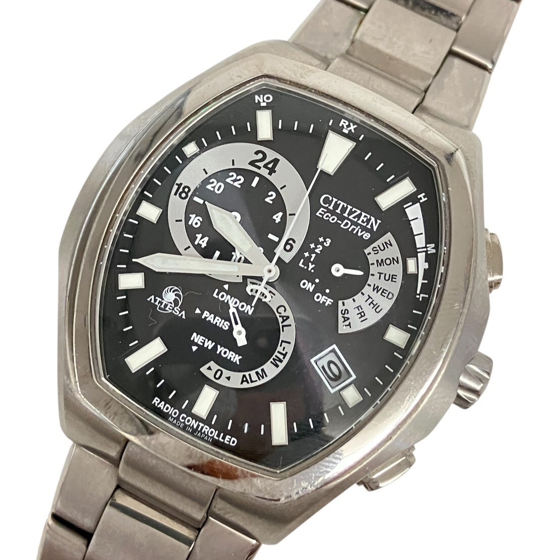 Y027-CH22-387◎ CITIZEN シチズン メンズ腕時計 ATTESA アテッサ E600-T006381 ECO-DRIVE クロノグラフ デイデイト ブラック文字盤 KA