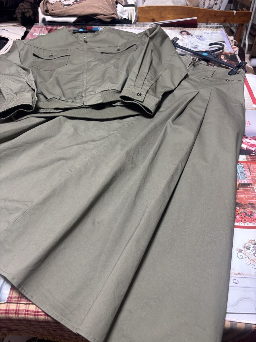 サイズ・・JK 身幅50、着丈55㎝位。スカート ウエスト幅ゴム37〜40、着丈80㎝位です。お色はカーキ系です。