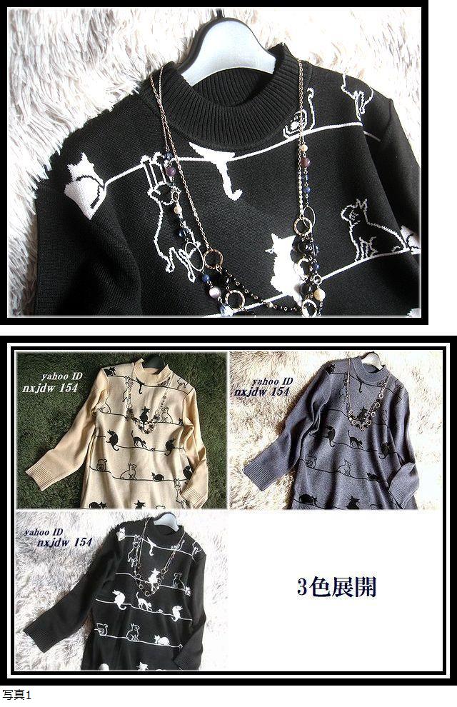 ◆Rose◇ゆったりワンサイズ・程よい厚みのハイゲージニット♪編み込みネコちゃんのハイネックtops/ブラック