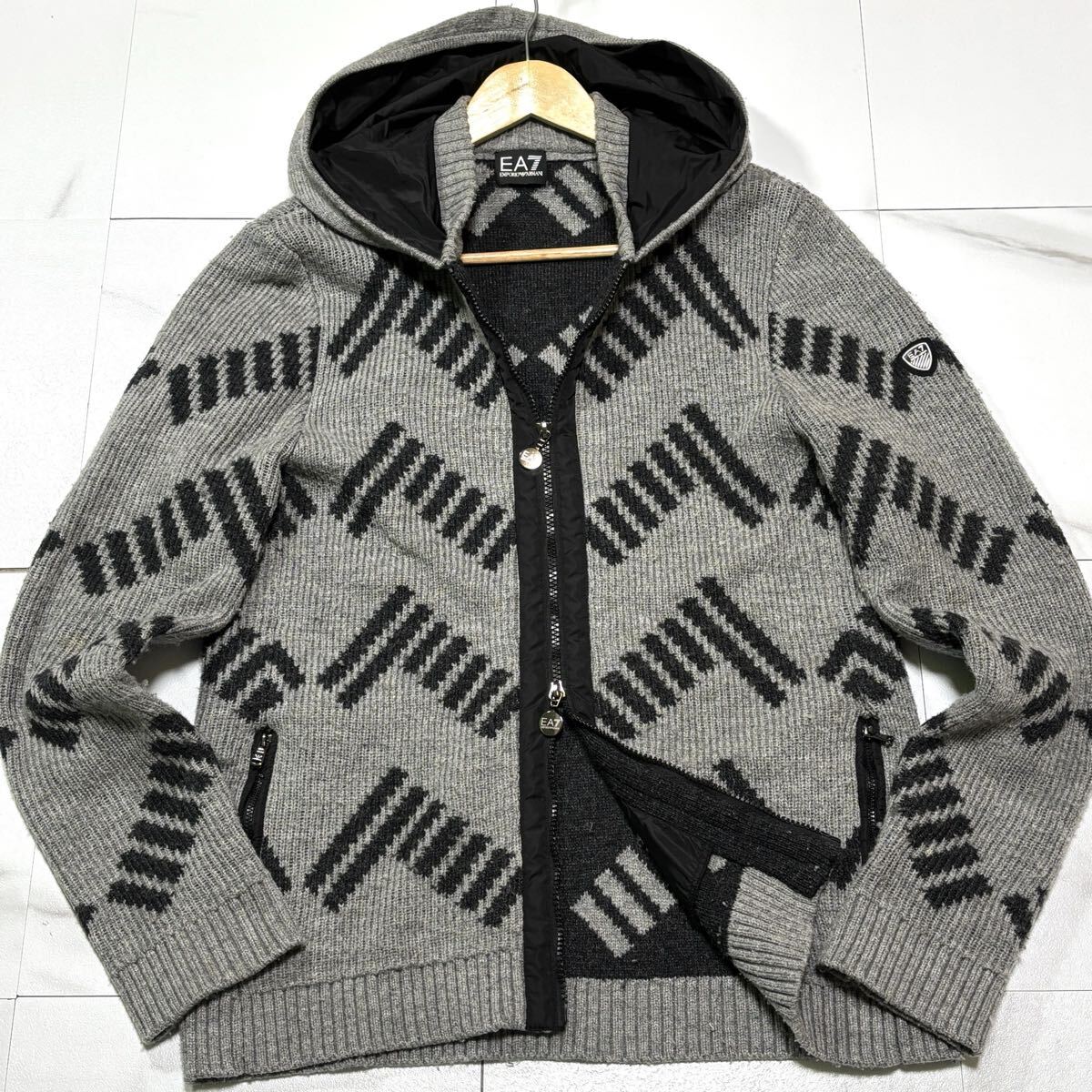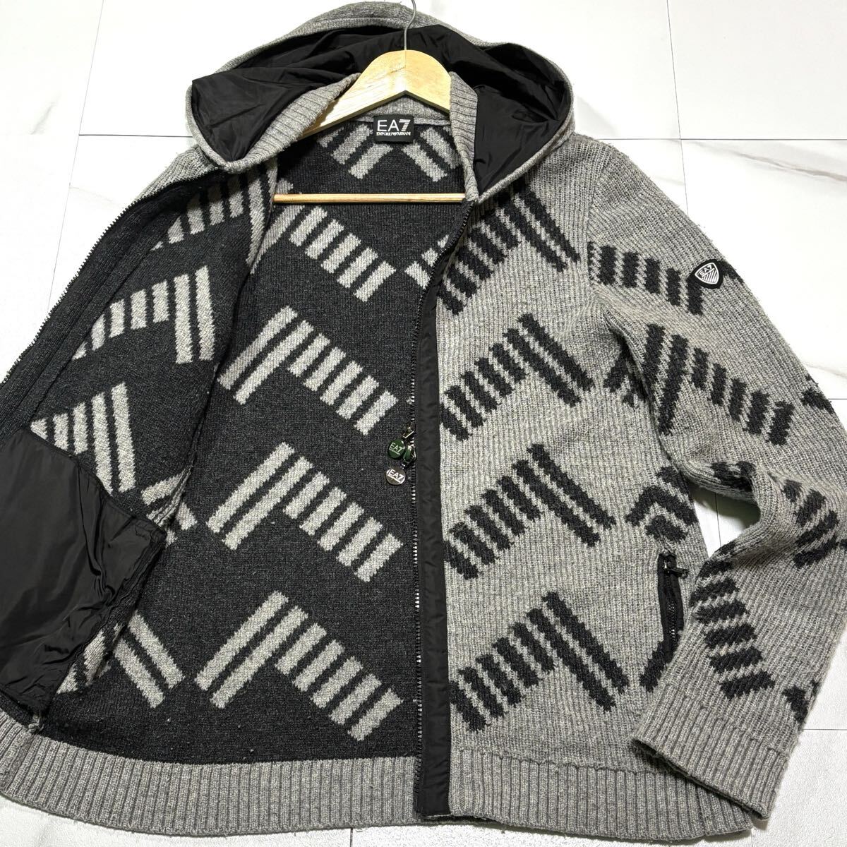 極美品/ Lサイズ EMPORIO ARMANI エンポリオ アルマーニ EA7 ニット パーカー 肩ロゴ 肉厚 ダブルジップ グレー