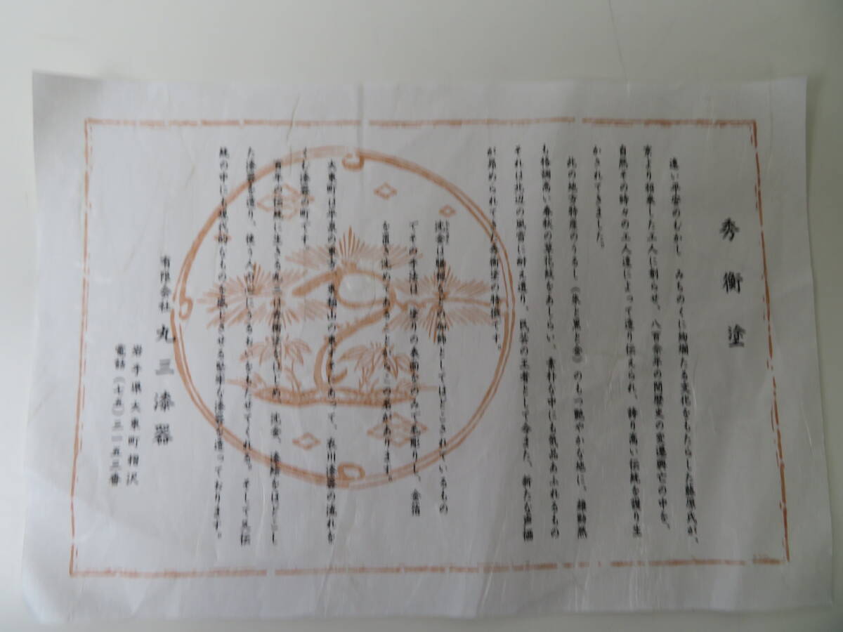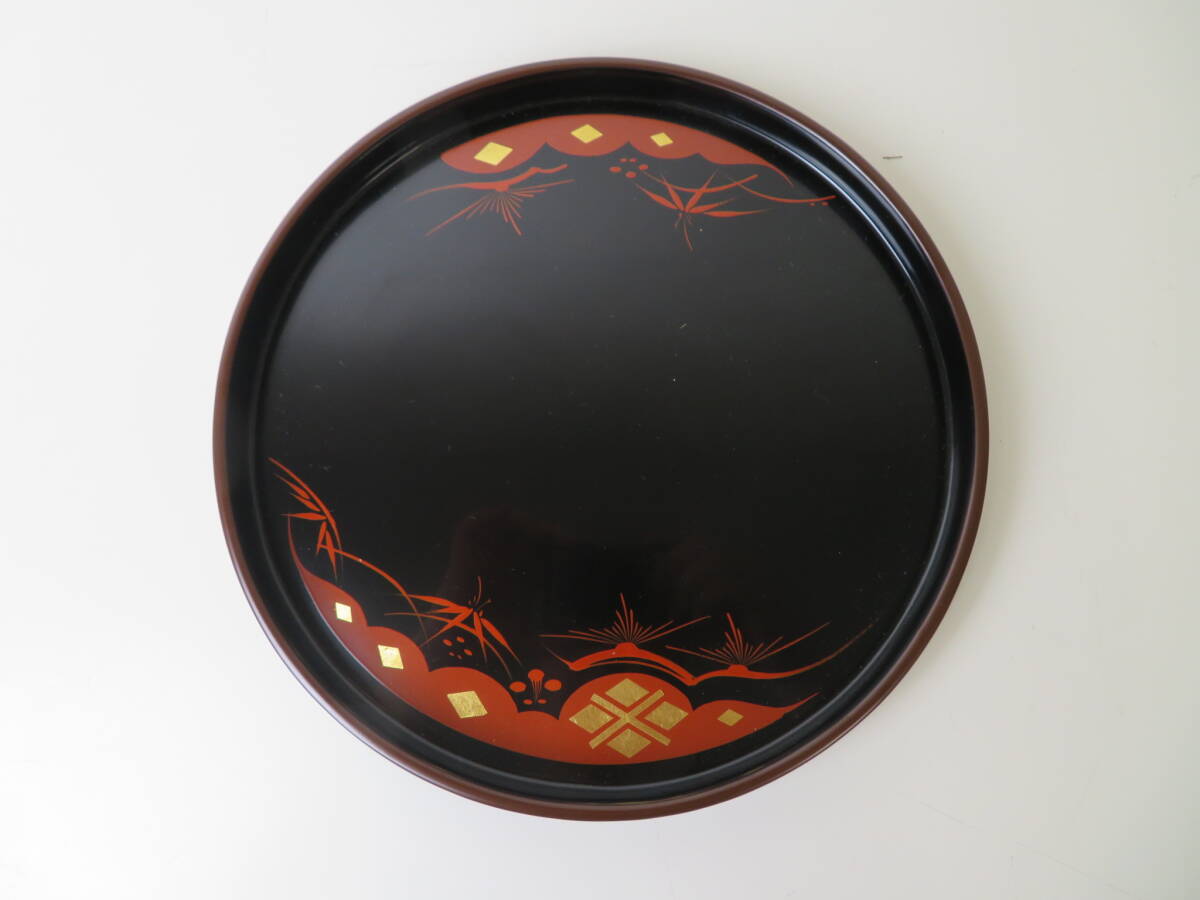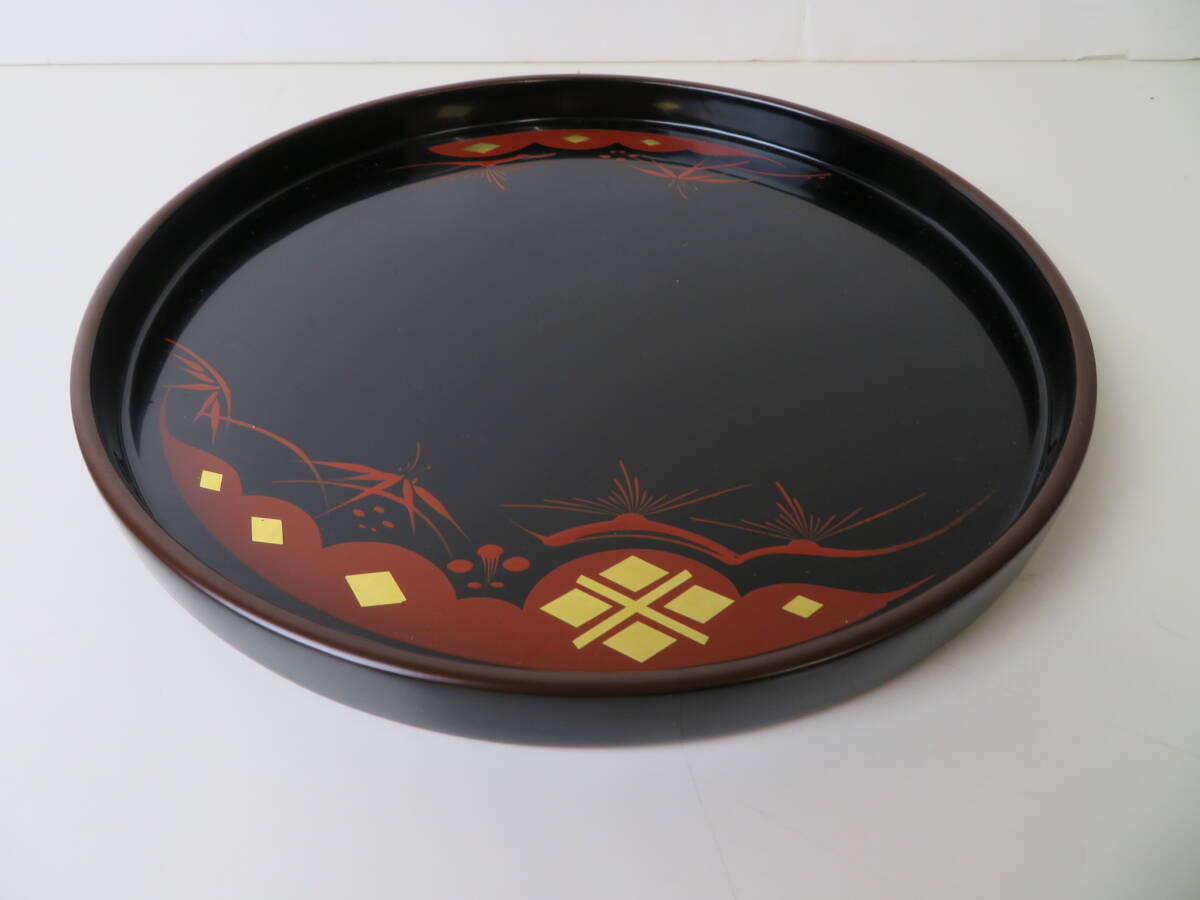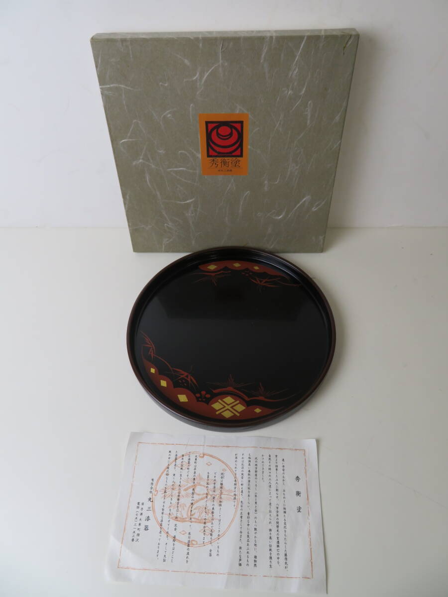 ▽【未使用・保管品】お盆 秀衝塗 丸三漆器 丸盆 松 直径約26.5cm 箱付 天然木 日本製 国産 岩手 漆器 伝統工芸