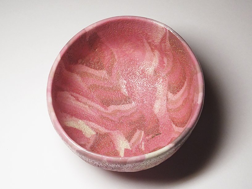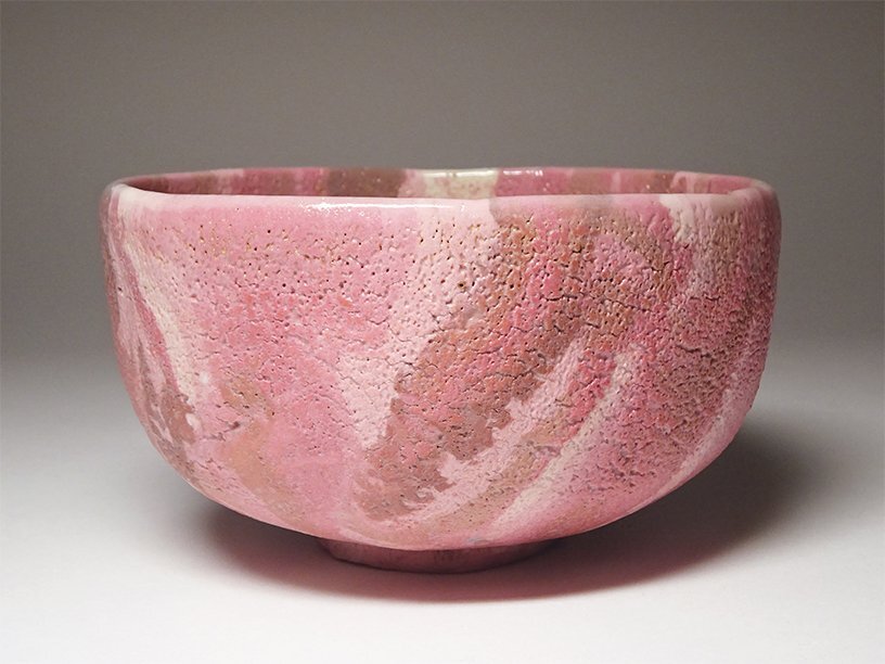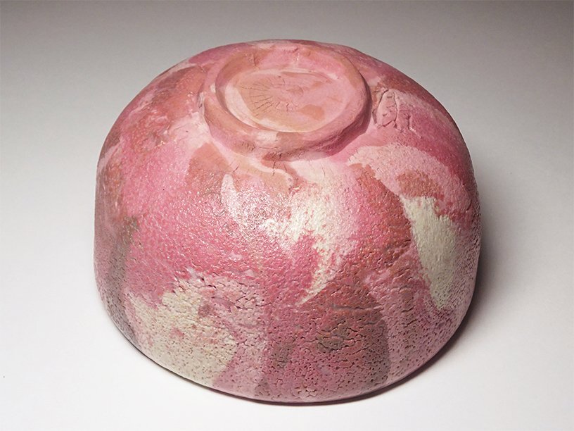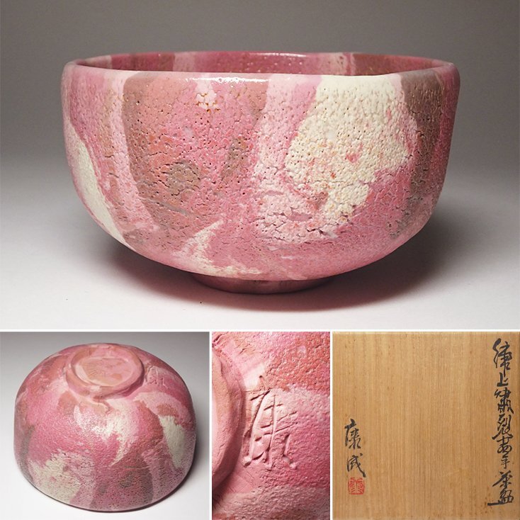 本物保証!         異なる土を重ねて文様のある素地を用いた成形技法〝練上〟を現代的な感覚で追求及び集大成し、1993年に国重要無形文化財保持者(人間国宝)に認定された近代陶芸界を代表する巨匠陶芸家【松井康成】(1927-2003)作。   『練上嘯裂茜手茶碗』です。       ピンクを基調にした緻密な練上げ技巧がされた芸術的な景色を見せる秀作です。       高台脇に「康」の掻き銘。   共箱付き。         状態は無疵完品で非常に良好といえます。          正真正銘本物保証!