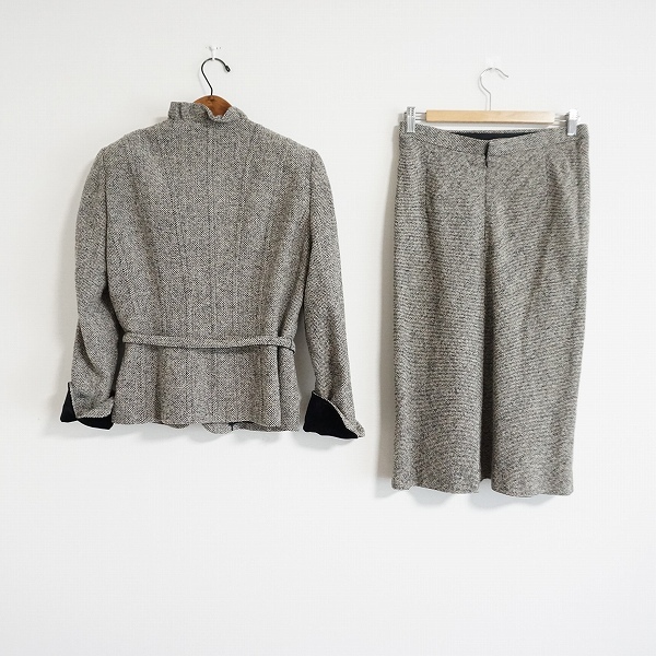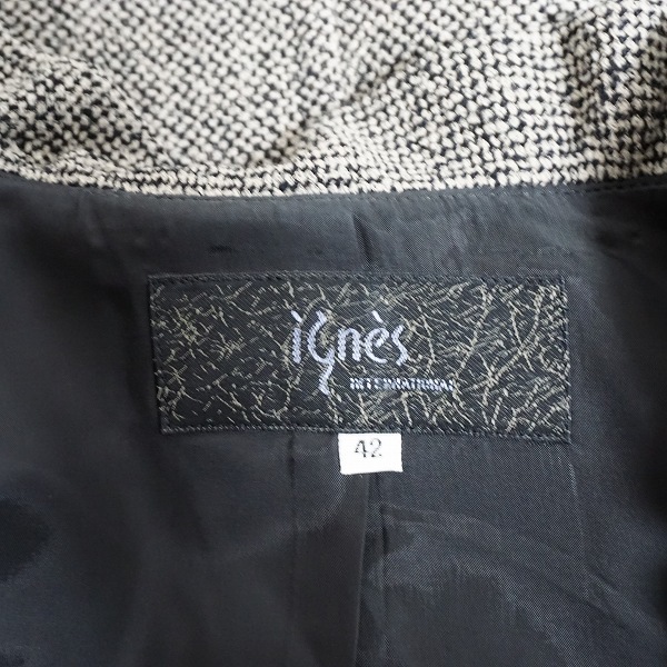 #wnc イネス 銀座マギー ignes スカートスーツ 42 黒 白 スタンドカラー ツイード ベロア使い リボンベルト レディース [867511]