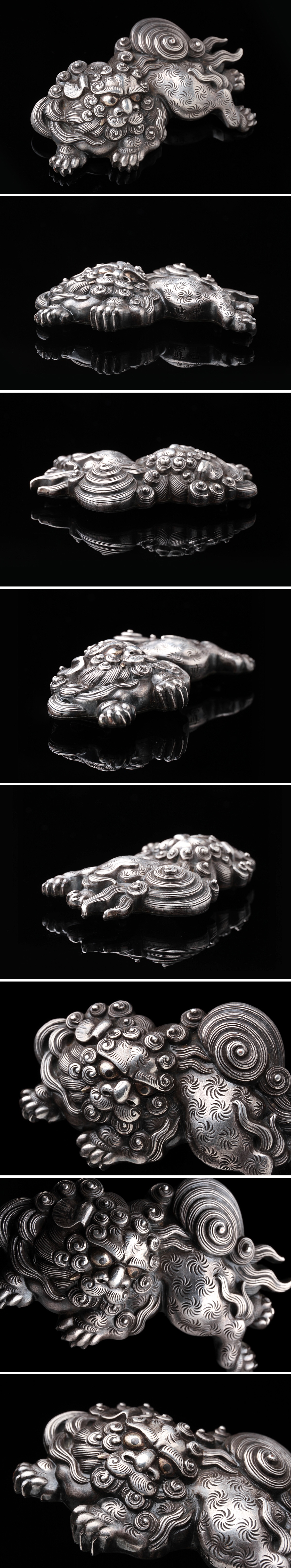 FE073 時代金工【華應 作】銀地金四分一眼 獅子帯留 横6.2cm / 重35g 木箱附・銀地獅子形帯止 装飾具 装身具 和装古美術 秀逸作