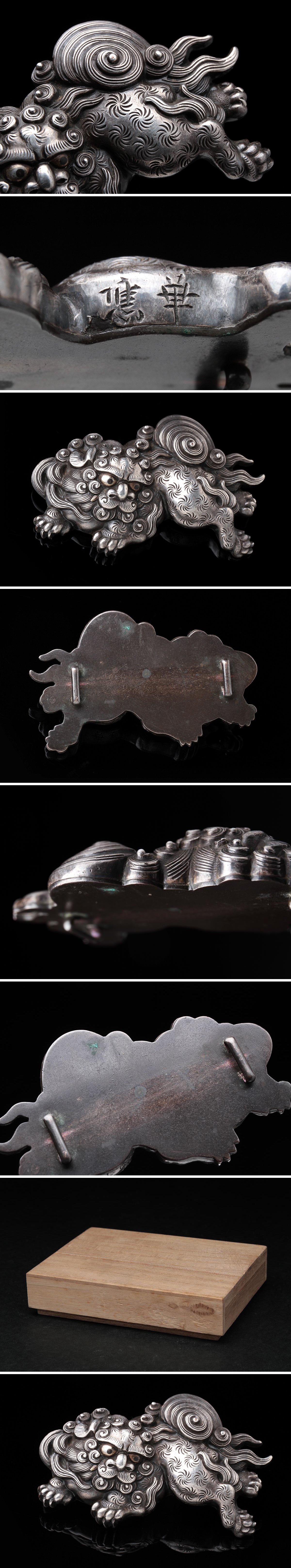 | ◆ 時代金工【華應 作】銀地金四分一眼 獅子帯留 横6.2cm / 重35g 木箱附・銀地獅子形帯止 装飾具 装身具 和装古美術 秀逸作 ◆