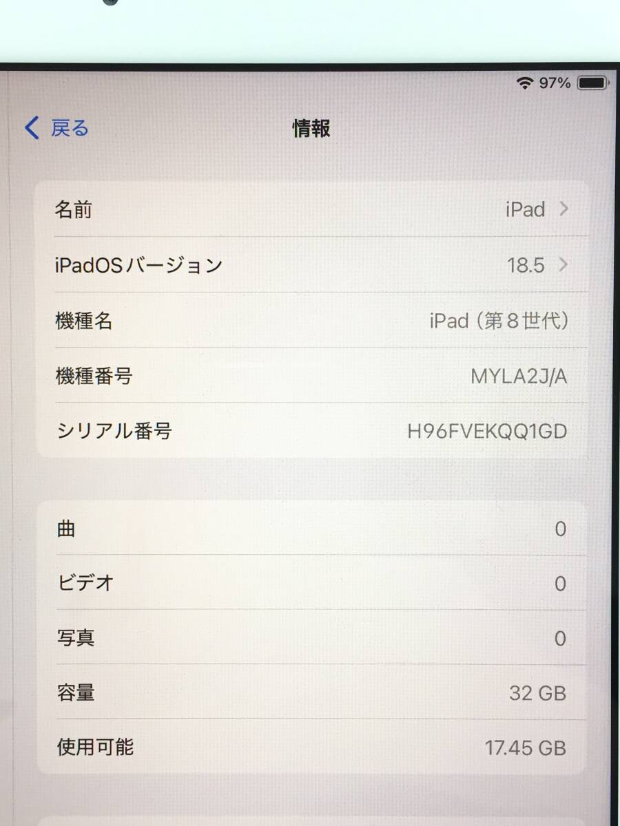 〇Apple iPad 第8世代 Wi-Fiモデル 32GB A2270(MYLA2J/A) シルバー 動作品 ※難あり