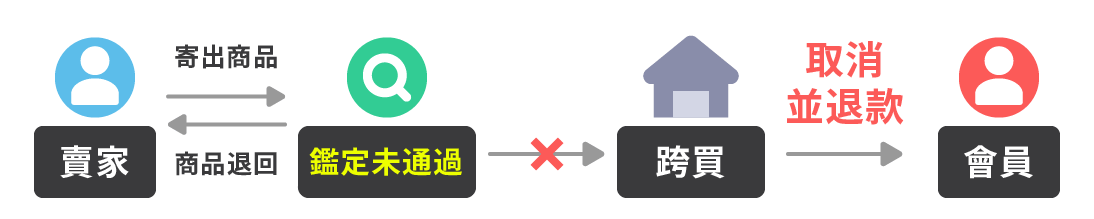 - 如未通過鑑定,商品退回賣家,取消交易並退款