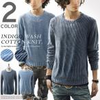 ニット メンズ 長袖 インディゴ 総柄 コットン クルーネック スリム ショート丈 カジュアル
