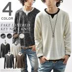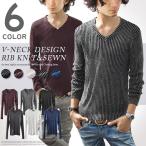 ニット メンズ 長袖 Vネック リブ トップス カットソー ミックス カラー スリム ショート丈 細身 カジュアル キレイめ