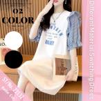 ワンピース 半袖 ミニワンピース Aライン 異素材 ロゴ 切り替え レディース ボリューム袖 体型カバー ゆったり フェミニン ガーリー 韓国 春夏