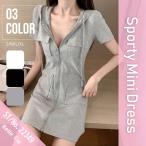 ワンピース ミニ丈 ミニワンピ ジップ スウェット 半袖 無地 レディース 韓国ファッション スポーティ ストリート 大きいサイズ フード シンプル