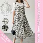ワンピース 半袖 Aライン フレア 花柄 モノトーン ドッキング レディース 韓国ファッション ガーリー モード 夏ワンピ 白黒 体型カバー 重ね着