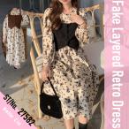 花柄 ワンピース レディース フェイクレイヤード ロングワンピース ガーリー フェミニン 長袖 大人かわいい ビスチェ 重ね着風 秋冬 春 デート マキシ丈