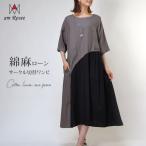 【送料無料】綿麻ローン異素材サークル切替ワンピース◆レディース ワンピース 切替 綿 麻 コットン リネン ロングワンピース 丸首 半袖