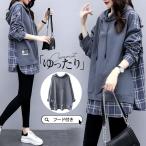 パーカー レディース 春夏 プルオーバー 配色 レイヤード風 長袖 チェック 重ね着風 フード付き カジュアル 可愛い カジュアル 秋冬 カットソー