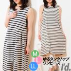 綿混 ボーダー柄 タック入り ノースリーブ ゆる タンクトップ Aライン ロング丈 ワンピース 身幅ゆったり 春夏 大きいサイズ M L LL 3690
