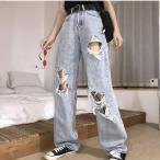 2A34ダメージデニムパンツ レディース サイドダメージワイドデニムパンツ かわいい ダメージワイドストレートデニム お出かけ デート バーゲン【送料無料】
