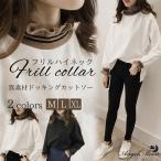 レディースカットソー 長袖 Tシャツ ハイネック フリル 異種素材 きれいめ カジュアル