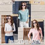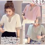 Tシャツ シフォン Vネック エレガント 半袖 五分袖 レディース