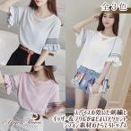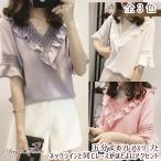 カットソー 半袖 フリル 五分袖 Tシャツ レディース