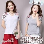 刺繍 Tシャツ 花柄 半袖 カットソー Vネック レース レディース