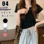 即納 Tシャツ レディース キーネック Vネック ヘンリーネック 半袖 ショートスリーブ 無地 ショート丈 短め スリム フィット ポリエステル 薄手