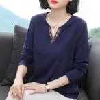 即納 キーネック 刺繍 ロングTシャツ 七分袖 レディース 無地 春秋 薄手 カットソー 長袖トップス ラウンド Vネック