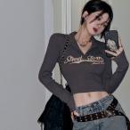 即納 ショート丈 襟付き 英字ロゴ 長袖 カットソー レディース Vネック クロップド丈 ロンT スリムフィット Tシャツ レトロ カジュアル