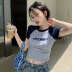 即納 ラグラン Tシャツ レディース トップス 半袖 ロゴ スリムTシャツ へそ出し クロップド丈 ちびTシャツ ラグランT おしゃれ Y2K 春夏