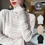 カットソー レディース 女性用 トップス 長袖 ハイネック タートルネック レース 透け感 薄手 シアー シースルー ギャザー シャーリング メロウフ