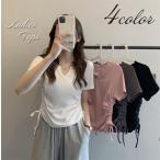 カットソー レディース トップス 半袖 キーネック ドローストリング シャーリング ひも 紐 リボン 無地 プルオーバー カジュアル おしゃれ かわい