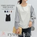 カットソー レディース トップス シャツ ブラウス ストライプ 長袖 クルーネック 異素材切り替え 20代30代40代 お洒落2