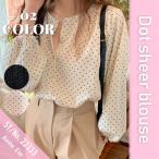 ブラウス シャツ トップス Uネック ドット 水玉 総柄 シアー レディース 韓国ファッション きれいめ フェミニン オフィス 上品 大人可愛い 柄