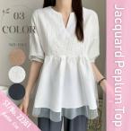トップス チュニック ペプラム 半袖 シアー 高見え チュール レディース ブラウス レース 上品 韓国ファッション シンプル 柄 Vネック 5分袖