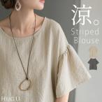 ブラウス ストライプ レディース トップス ベル袖 ロング シャツ チュニック 綿ライク しぼ感 ワッシャー フリル 半袖 しわになりにくい クルーネック 軽い 薄手