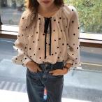 シフォンブラウス レディース長袖 秋服 春秋 トップス ドット柄 パフスリーブ タック入れ リボン付き 大人おしゃれ 可愛い プルオーバー 春夏秋 ドットブラウス