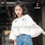 ブラウス 七分袖 レディース 夏服?クルーネック トップス 花柄 ラッパ袖 かわいい おしゃれ お出かけ 通勤 女の子 女性用 婦人用 グレー ホワイ