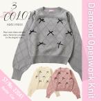 リボン ニット トップス セーター レディース 透かし編み ダイヤ パール フェミニン 韓国ファッション 柄 コンパクト クルーネック 可愛い