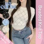 サマーニット トップス 半袖 ビジュー きれいめ ショート丈 春 レディース 韓国ファッション オフィス 大人 かわいい フィット ダイヤ おしゃれ