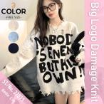 ニット セーター 長袖 ゆったり ロゴ パンク バンド ストリート レディース 韓国ファッション 白 黒 グレー ざっくり 秋冬 ダメージ ロック