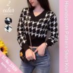 ニット セーター 長袖 ショート丈 Vネック ぴったり レディース 千鳥 総柄 韓国ファッション チドリ 柄 セクシー ギャル きれいめ 上品 短丈