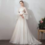 ウエディングドレス ロング丈 トレーンタイプ 袖あり 花嫁 結婚式 パーティードレス フォーマル ラウンド ベルスリーブ 大きいサイズ プリンセスドレス 締め上げ