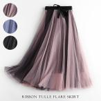 スカート レディースロング 春夏 黒 チュール フレア ミモレ丈 ひざ丈 ミディア ロング ブラック グレー ベージュ ウエストゴム 20代 30代 40代