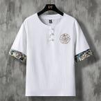 綿麻風 Tシャツ メンズ 半袖 夏 新作 チャイナボタン クルーネック 刺繍 大きいサイズ 2L 3L 4L 5L 部屋着 トップス リ