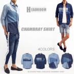 カジュアルシャツ メンズ 3カラー切替ブロッキング7分袖シャンブレーシャツ