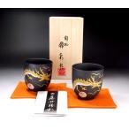 有田焼 陶芸家 藤井錦彩作 艶消し黒釉金彩唐草文様波渕湯飲みペアセット