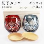 切子 フリーグラス 2個 ペアセット ブナ小皿付き 4点セット 桐箱入り (赤・インクブルー)食洗機対応 (切子硝子 切子ガラス カットグラス)