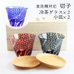 切子 冷茶グラス 2個 ペアセット ブナ小皿付き 4点セット 桐箱入り (コバルト(紺)・赤・インクブルー)食洗機対応