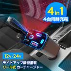 4in1 4台同時充電 カーチャージャー 巻き取り式 アンビエントライト シガーソケット 充電ケーブル 12V 24V 車 スマホ USB タイプC ライトニング 急速充電 リール