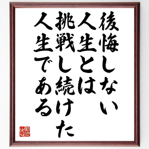 名言「後悔しない人生とは、挑戦し続けた人生である」手書き書道色紙額/受注後の毛筆直筆